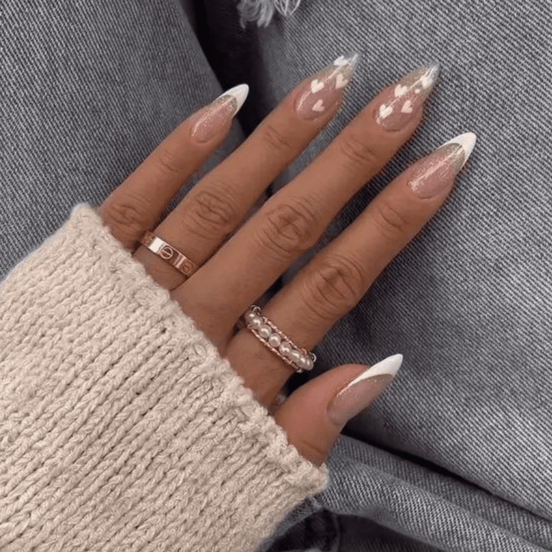 White nails with tiny hearts are timeless and always in style. They’re clean, crisp, and endlessly customizable.