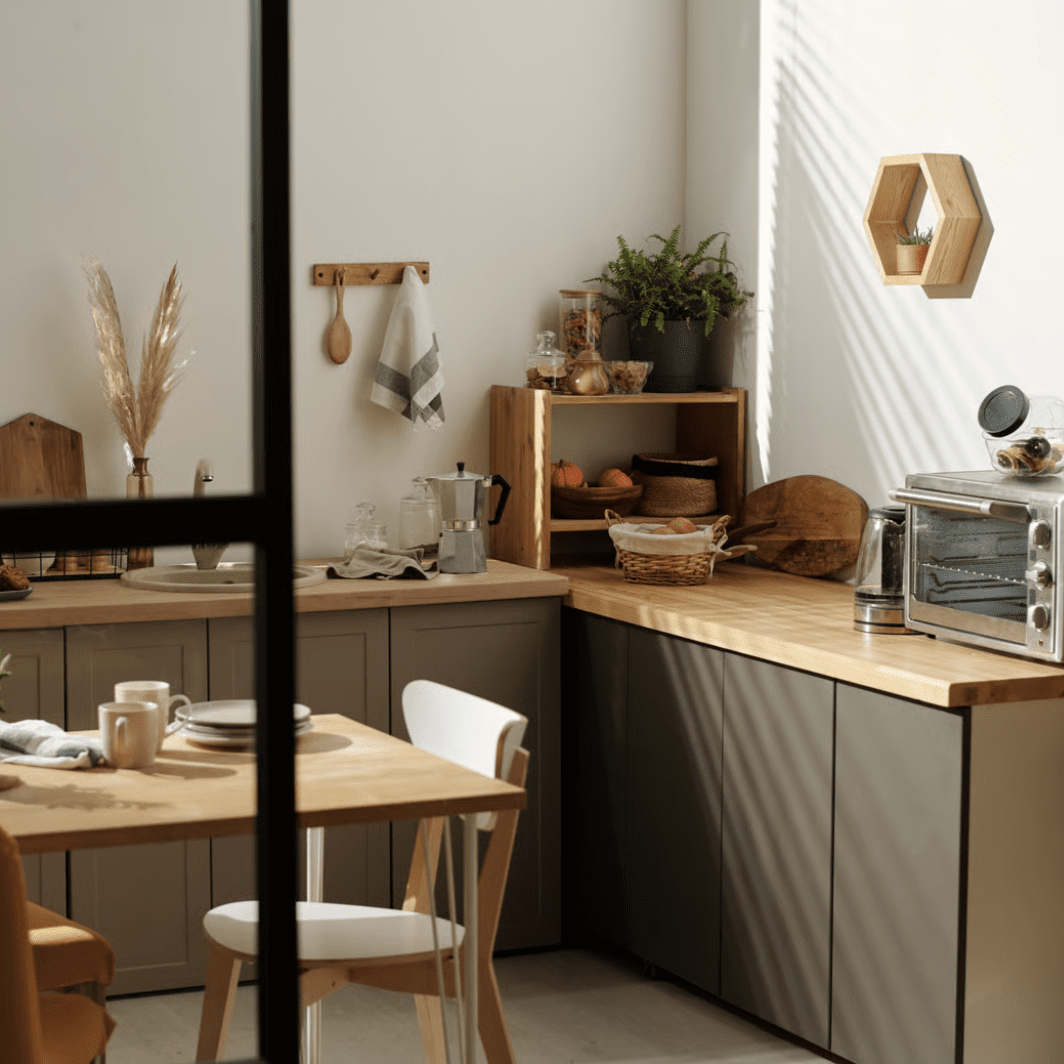Japandi design combineert de minimalistische esthetiek van Japans design met de warme en gezellige elementen van Scandinavisch design. Denk aan rieten lampenkappen, bamboe accessoires en meubels met strakke lijnen. Deze stijl voegt een serene en warme sfeer toe aan je moderne warme keuken. Rieten lampenkappen geven zacht, diffuus licht dat de ruimte nog warmer doet aanvoelen.